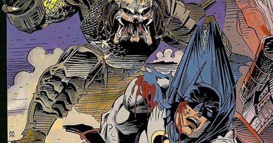 Em HQs da DC Comics, é comum encontrarmos alguns crossovers entre super-heróis e outros personagens que não fazem parte da editora. Na década de 90, foi a vez do Predador protagonizar uma trilogia desses quadrinhos, na qual enfrentava o Homem-Morcego.