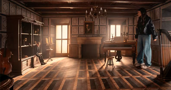 “As [cenas] mais divertidas – se não também as mais desafiadoras –, de filmar, foram nos cômodos do castelo. Tem o quarto de Ames com o desnível que muita gente conhece, mas construímos como se fosse parte de uma antiga mansão francesa. Todos os objetos da cena tiveram que ser impressos em 3D para se encaixarem perfeitamente na perspectiva em que aparecem no enquadramento. Foi muito legal, mas também um desafio acertar a perspectiva exata – afetou o posicionamento da câmera e tudo mais”, completou Fleischer.