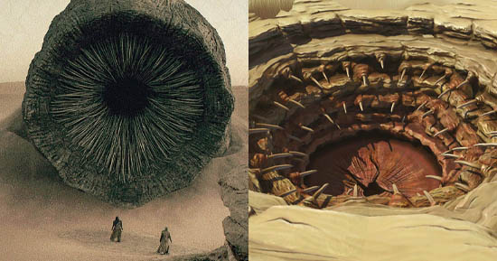 Os desertos e a importância na trama não são as únicas semelhanças entre os territórios explorados nas duas histórias. Os vermes de areia - ou Shai-Hulud - de Duna, que habitam as terras de Arrakis, são bem parecidos com o Sarlacc, criatura que vive debaixo das areias de Tatooine.