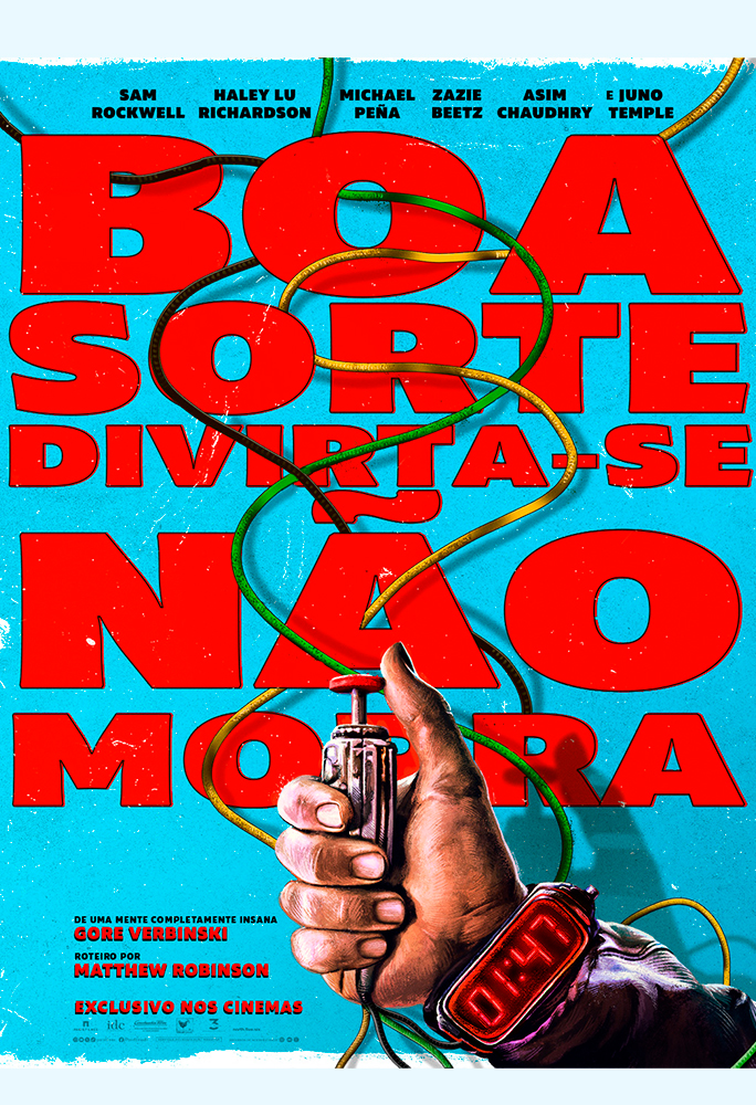 Com cores vibrantes, o pôster destaca a imagem de uma mão prestes a apertar uma bomba em contagem regressiva, reforçando o clima de urgência que permeia a narrativa.