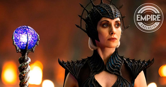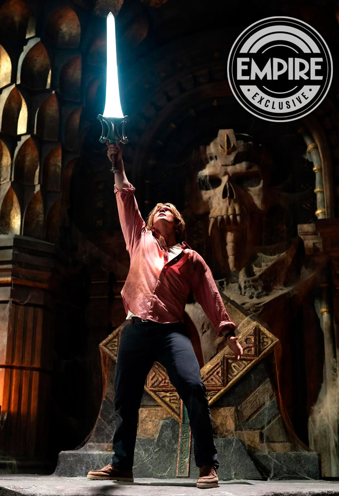 Em um registro, o protagonista, ainda com roupas casuais, ergue sua icônica espada brilhante para o alto; enquanto o outro revela mais detalhes da caracterização de Alison Brie (‘Juntos’) como a bruxa Maligna.