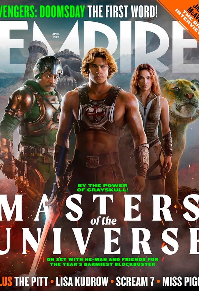 Na primeira, que será comercializada nas bancas do Reino Unido a partir de 12 de fevereiro, Nicholas Galitzine, surge pronto para ação como He-Man, acompanhado por Teela (Camila Mendes), Mentor (Mentor) e Gato Guerreiro. Já a segunda, exclusiva para assinantes, traz uma evocação deslumbrante do Castelo de Grayskull em um estilizado no visual hair metal.