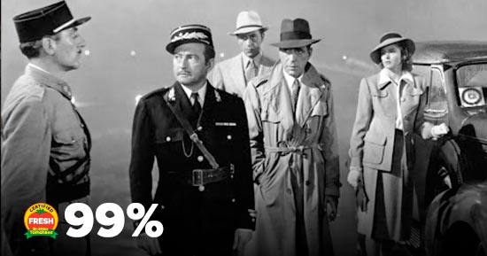 “Nós sempre teremos Paris” - difícil encontrar um verdadeiro cinéfilo que não conheça essa frase icônica de Casablanca. Além do amor impossível entre os personagens de Humphrey Bogart e Ingrid Bergman, o filme também levanta questões como o exílio e o regime nazista. Mesmo sendo gravado durante a Segunda Guerra Mundial, o longa desenvolveu problemáticas sobre o conflito - Casablanca ocupa a oitava posição, com 99% no Tomatômetro.
