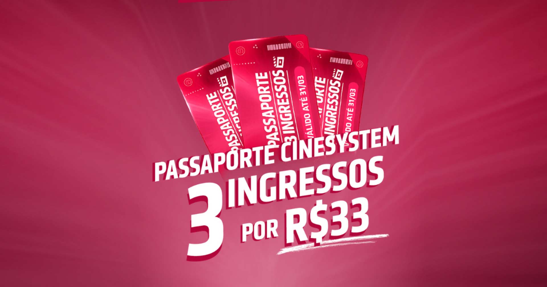 Atenção, cinéfilos: exclusivamente hoje, 3 de março de 2026, a rede Cinesystem traz a promoção 3do3: você compra um pacote com 3 ingressos de cinema por apenas R$33 - R$11 por ingresso. O desconto é válido apenas para compras on-line na Ingresso.com.